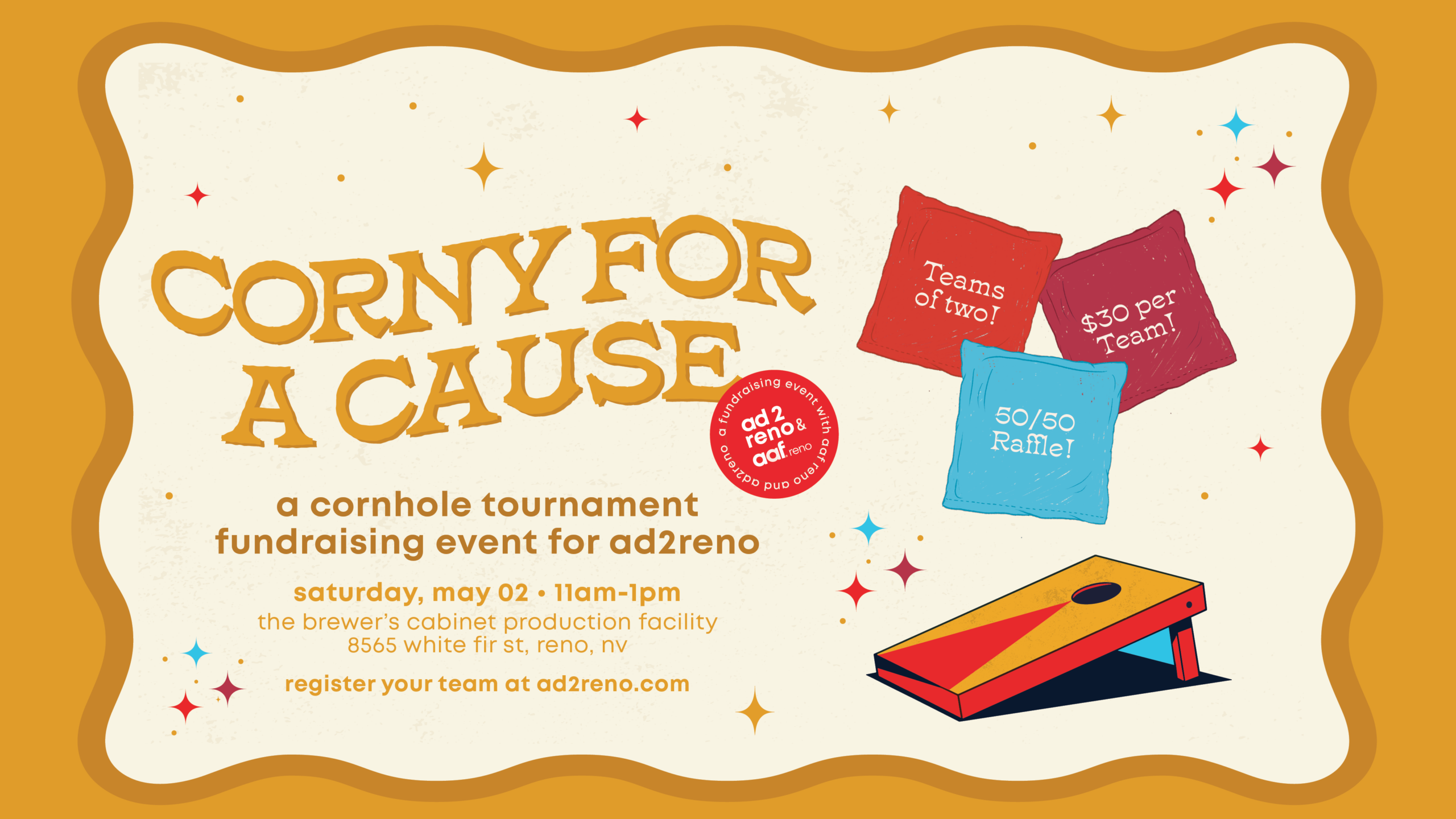 Get ready to toss bags, eat good food, and do a little good while you’re at it. Ad 2 Reno and AAF Reno are teaming up for Corny for a Cause: a cornhole tournament that’s equal parts competitive, community-driven, and (we won’t apologize for it) a little corny.